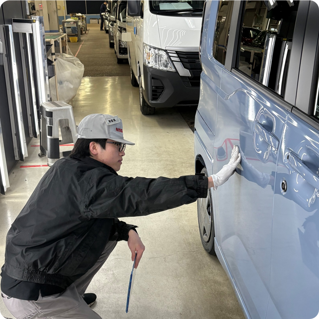納車前の車両の検査が主な業務になります。検査には外観検査と完成検査の2種類あり外観検査では外装を検査し、完成検査では内外装検査と取付オプション部品の装着が基準通り出来ているかをチェックしてお客様にお届けしています。