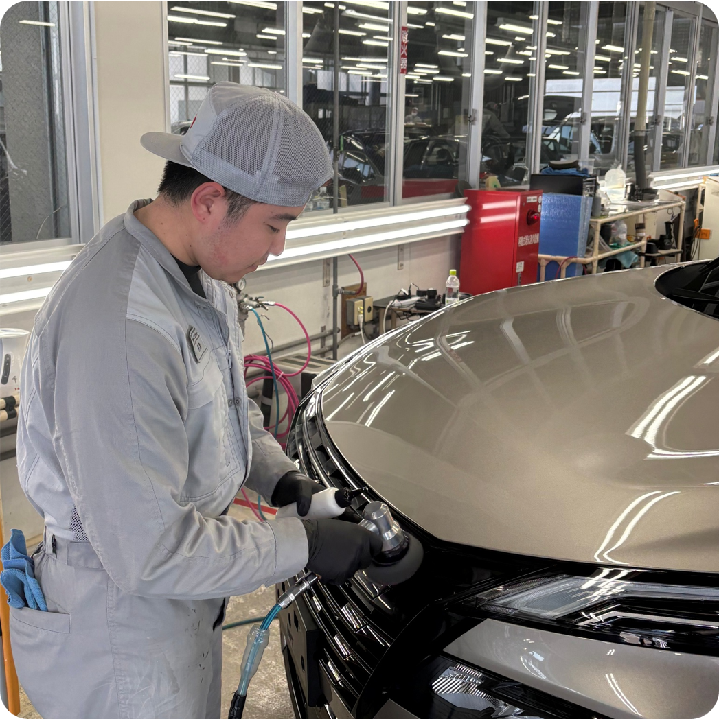 私は「新車整備課リペア係」に所属しています。主な仕事は車両ボディーの磨き作業をしています。新車とはいえ生産工場からお客様に届ける過程において、ごく稀に輸送時に付いてしまう少しのキズや汚れを綺麗にする仕事です。